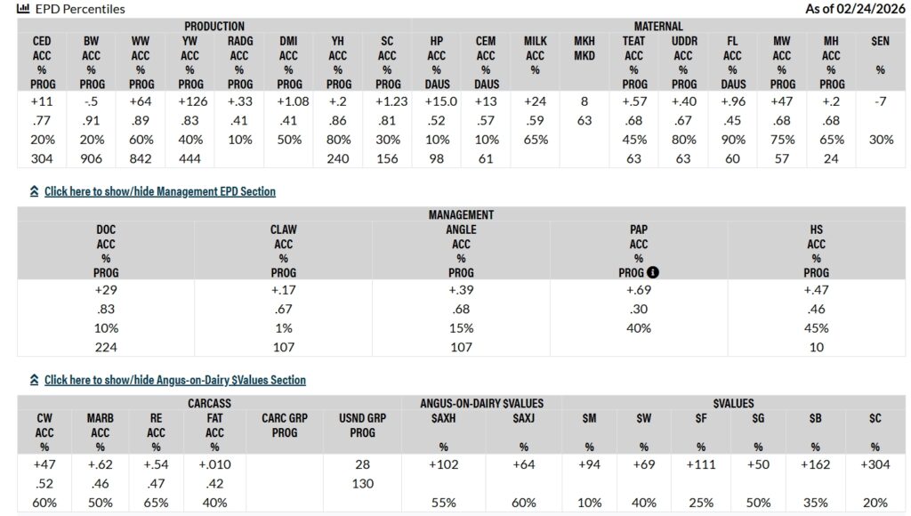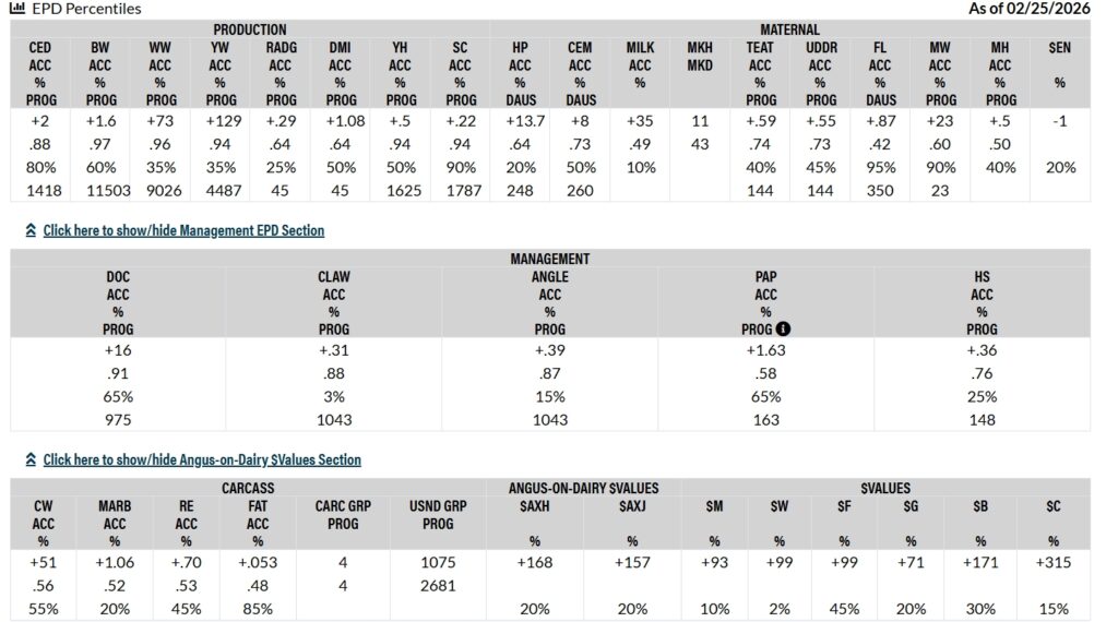 559 has 156 progeny with a weaning ratio of 105, 58 with yearling ratio of 105, 35 daughters with milk ratio of 103 and is a Pathfinder sire.